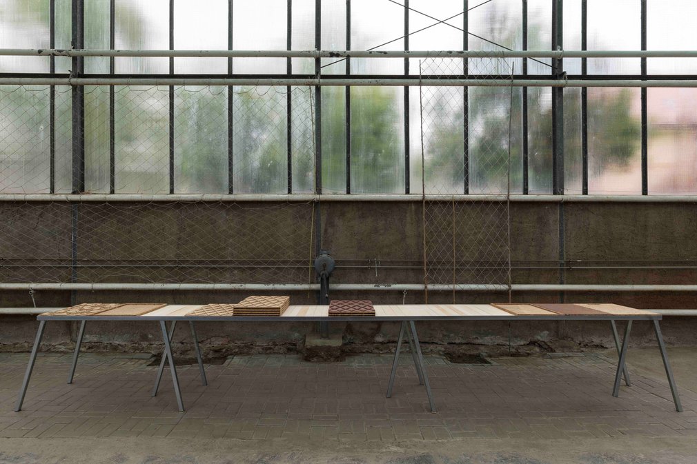 Oberflächen, urbane Archäologien und Territorien, die Spuren menschlicher Aktivitäten aufweisen,gehören zu den Schwerpunkten von Alison Darby. Ihre skulpturale Installation Chip (2024)untersucht den menschlichen Einfluss auf die Landschaft der Ryck-Wiesen – mit Augenmerk aufagrikulturelle Praktiken, die Einteilung von Landschaft und neuartige Bewirtschaftungsformenwiedervernässter Moore. Im Zuge ihrer Recherche untersuchte sie drei Phasen in der Geschichte derRyck-Wiesen, erstens den Boltenhäger Teich, der ab dem 12. Jahrhundert zu Fischereizweckeneingesetzt wurde, zweitens die Komplexmelioration [1] für Landwirtschaft zu DDR-Zeiten Ende der1960er-Jahre und drittens die zukünftig anvisierte Paludikultur, das heißt die nasse Bewirtschaftungvon Moorböden. Auf zwei langen Tischen präsentiert Darby in Chip skulpturale Spanplattenreliefs ausFasern von Paludikulturpflanzen wie Schilf, Rohrglanzgras und Segge. Die Spanplatte gilt als poveresMaterial, sie besteht aus gepressten Spänen unterschiedlicher Herkunft und Zeit, die mit Bindemittelgemischt wurden. Dieses barrierearme und alltagsnahe Material setzt Darby ein, um sowohl auf dieTransformationsgeschichte als auch auf die mögliche, wiedervernässte Zukunft der Ryck-Wiesen zuverweisen. In die Paludikultur-Spanplatten wurden Reliefs gepresst, deren Motive eng verbunden mitden Produkten aus der landwirtschaftlichen Nutzung der Ryck-Wiesen sind. Sie bestehen ausgemalten Fischernetzen, die an den Zeitraum vor der Entwässerung erinnern und aus Erdbeerreliefs,die an die Melioration und nachfolgende Erdbeerfelder im Steinbecker Vorstadt Polder zu DDR-Zeitendenken lassen. Manche ihrer reliefierten Bildträger enthalten in ihrer oberen Schicht Elemente ausErdbeertrestern[2], die einen fruchtigen Geruch verströmen. Das dritte Motiv sind frei stehende undgestapelte Norm-Transportkisten, etwa zum Transportieren von Obst und Gemüse. Mittels ihrerreduzierten Darstellung gelingt es Darby, auf die Geometrische Abstraktion in der Abstrakten Malereiund Bildhauerei und deren prägende Formprinzipien Reduktion, Wiederholung und Serialität Bezugzu nehmen. Bei genauerem Hinsehen lösen sich die Erdbeer-Ornamente zunehmend in dieAbstraktion auf und die Seitenwände der Normkisten werfen üppige Falten – das heißt die von Darbyausgewählten Formprinzipien werden sowohl spielerisch etabliert als auch wieder aufgelöst.Vergleichbar mit einer Verkaufspräsentation sind die Platten nebeneinander und übereinandergestapelt ausgestellt und weisen mitunter sogar für Transportbehältnisse typische Handgriffe undVertiefungen auf. Die Künstlerin re-erzählt die verflochtene Landschafts- und Industriegeschichte derRyck-Wiesen auf formaler, materieller und räumlich-körperlicher Ebene.